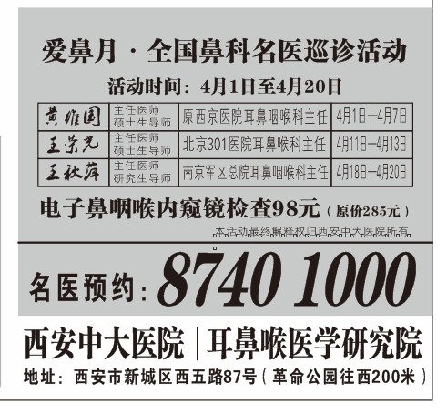 值爱鼻日之际,为了引起公众对呼吸健康和鼻部疾病的关注,由华商报、西安晚报、中国五官健康基金会联合举办的【2014爱鼻月公益筛查暨鼻科名医巡诊活动】盛大开启,活动旨在提高人们的对耳鼻喉健康防范意识,更多关注自身的耳鼻喉健康问题。活动期间不仅有知名耳鼻喉医生坐诊,更有多项鼻病筛查项目优惠。名额有限,快速报名吧!预约电话:029-87401000